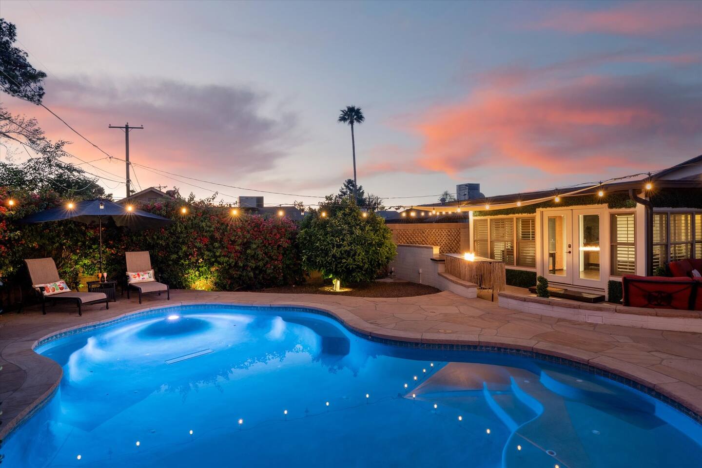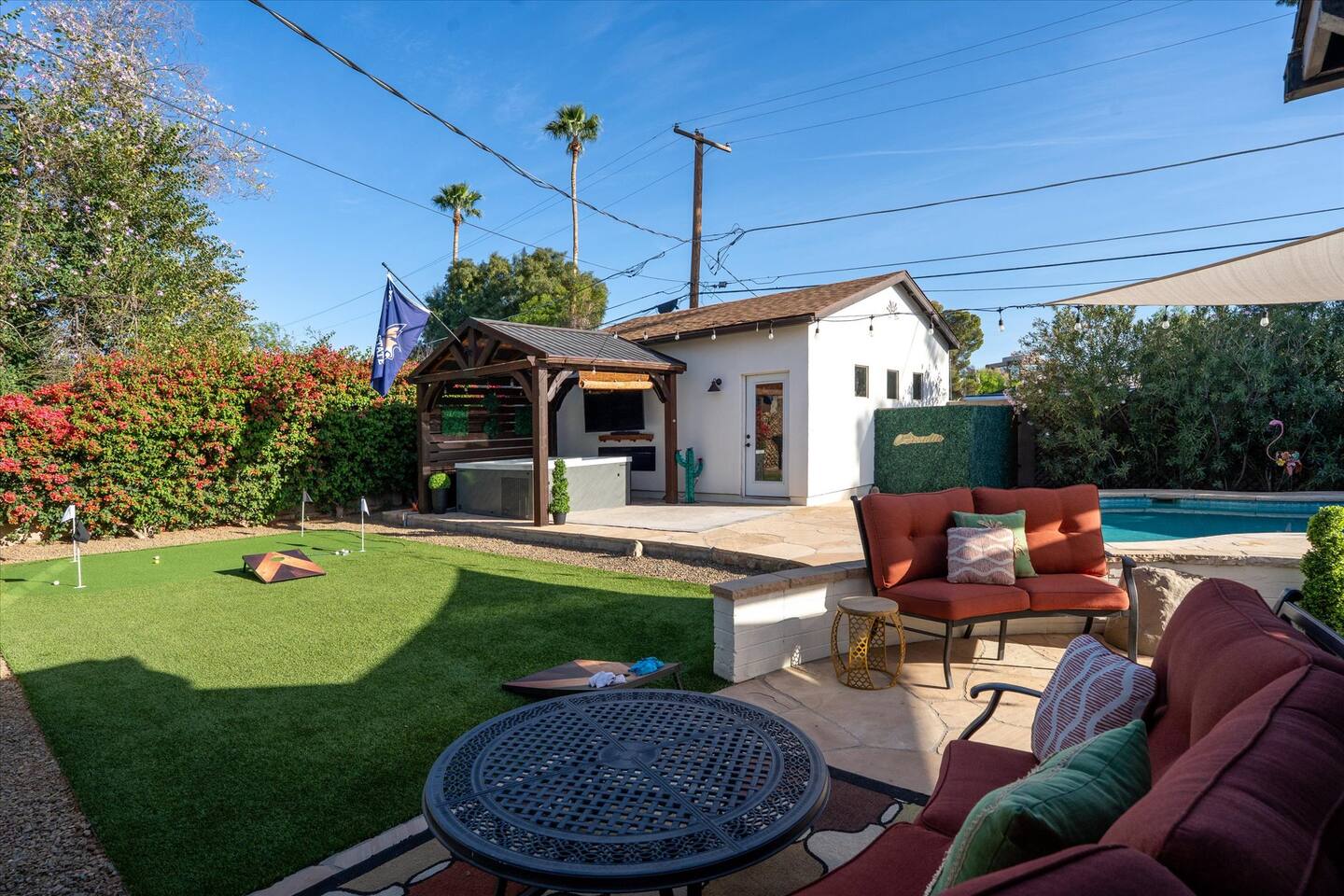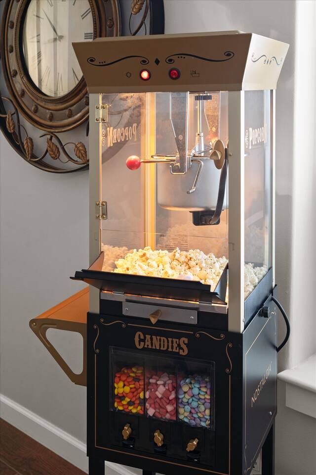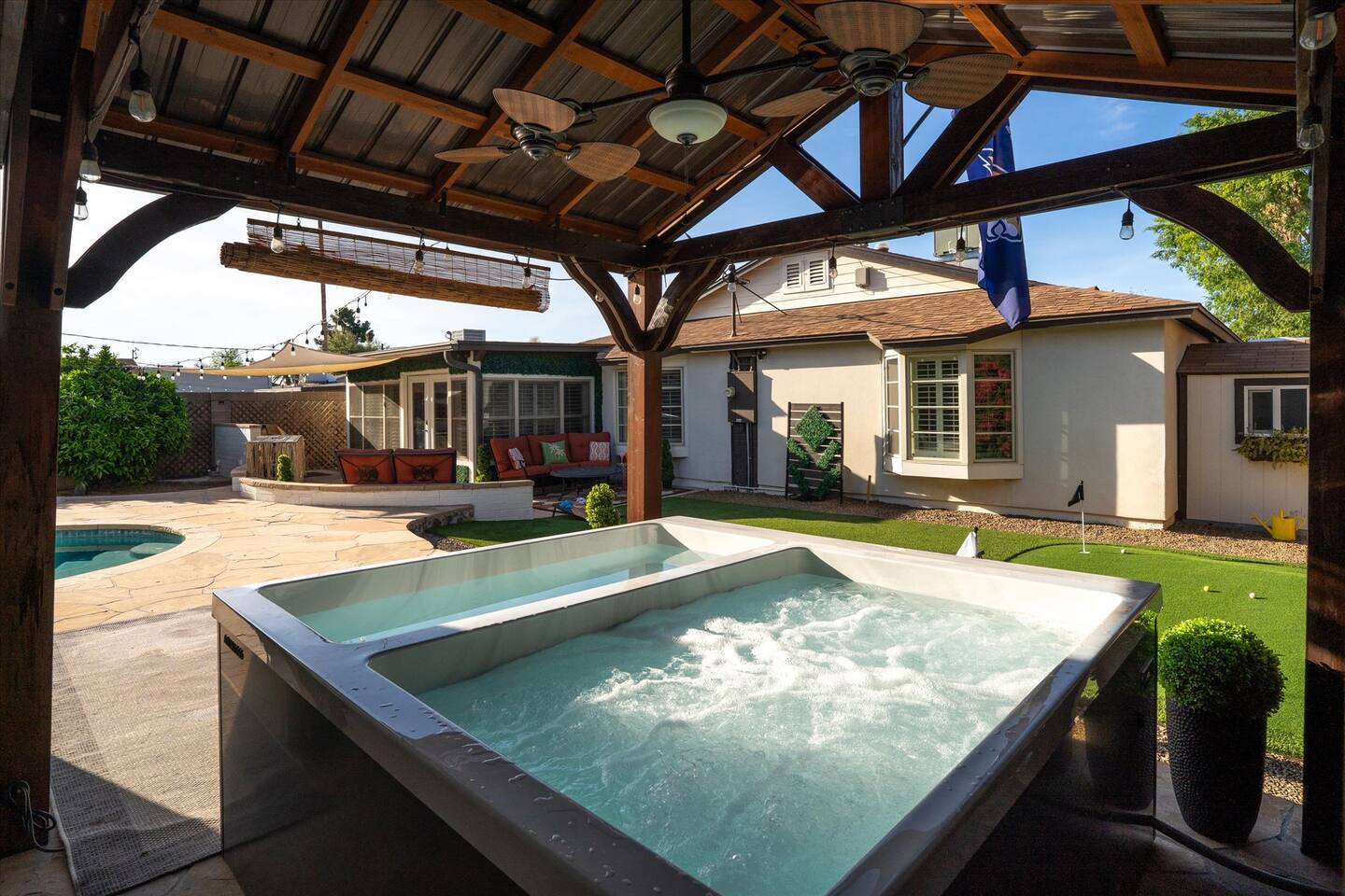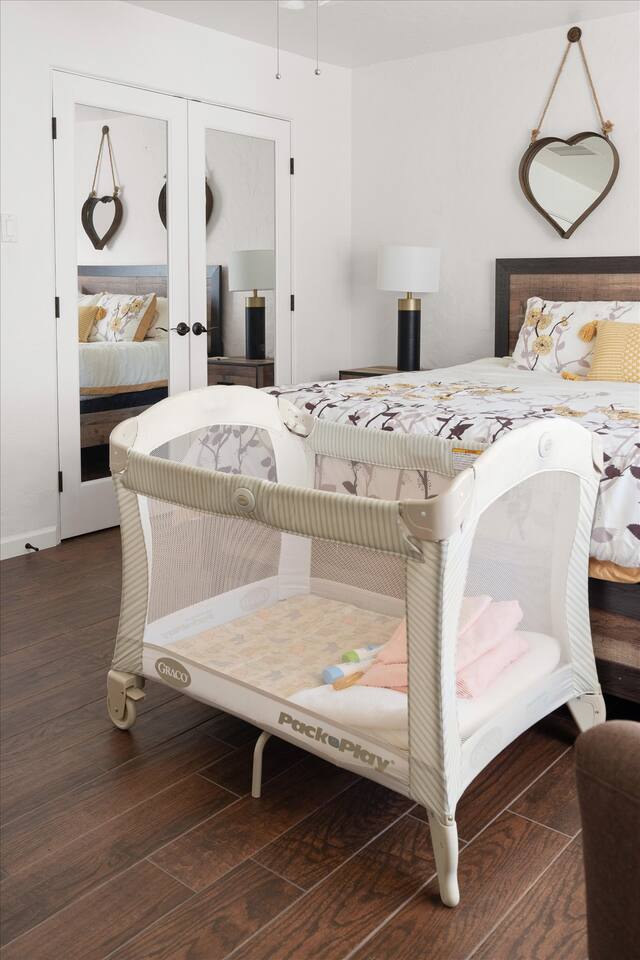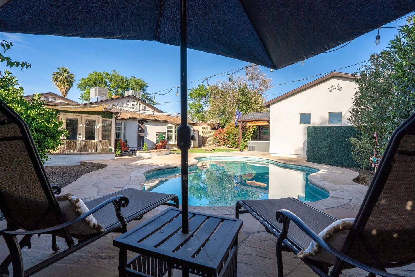 WHAT THIS PLACE OFFERS Bedrooms (4 - 2 King Beds & 2 Queen Beds) Bathrooms (3 Full) Bathtubs (2) Hair dryers & curling irons in each bathroom Cleaning products in each bathroom EcoWell H2O Therapy shampoo & body wash Hand soap in each bathroom & kitchen Navien NPE-240A on-demand hot water system Bath and pool towels Toilet paper, paper towels & Kleenex tissue Closet hangers Bed linens (2 sets per room) Room-darkening shutters and shades Ensuite walk-in closets, closets, nightstands, luggage stands and dressers Baby Pack ’n play/Travel crib Pool safety fence/gate system available HVAC - 2 air conditioning/central heating units Ceiling fans Christmas decorations LIVING ROOM & HOME THEATER Living room 85" Roku HDTV, Samsung Soundbar, designer couch/ottoman with 2 leather chairs 120" ONN Roku TV projector system, Sony surround sound speaker system and 2 leather reclining theater couches Nostalgia old-fashioned popcorn cart with candy dispenser Extra pillows and blankets Books, magazines and reading material Children’s books and toys Board games, trivia games, playing cards and puzzles HOME OFFICE & SUN/WELLNESS ROOM T--Mobile WIFI tower & service Dedicated adjustable height desk workspace with ViewSonic monitor and Logitech keyboard & mouse Private Sunlighten Amplify II 2-person full spectrum infrared sauna with chromotherapy & 2-speaker Bluetooth audio system ONN 44" Roku HDTV Gym Weights (5-20 lbs), Yoga Mats (2) & Resistance Bands Twin sofa sleeper bed for 2 kids and/or 2 extra guests KITCHEN, DRINK BAR & DINING Thermador & Whirlpool kitchen appliances Space where guests can cook their own meals Whirlpool refrigerator/freezer Whirlpool microwave/oven combo Frigidaire beverage refrigerator & Kismile icemaker Thermador natural gas cooktop/oven Thermador dishwasher Garbage disposal Dining table (6-person) Bar stool dining (2-person) COOKING BASICS Pots and pans Dishes, silverware and glassware (plastic sets for pool area) Bowls, chopsticks, plates, cups, etc. Keurig 2.0 coffee machine Haden hot water kettle Chefman coffee maker Wine and drink glassware (plastic sets for pool area) Toaster Baking sheet, tin, glassware and cooling racks Pizza sheet Breville blender BACKYARD OASIS Private outdoor lighted saltwater pool (not heated) - available all year, open specific hours, pool toys, child safe fencing system available to put in by guests, as needed, open from 7:00 AM to 9:00 PM Private Aquavoss hot/cold tub - available all year, open specific hours with outdoor entertainment systems (TV + soundbar) and Fosi Audio BT20A Bluetooth sound system, open from 7:00 AM to 9:00 PM Outdoor furniture Sun loungers (2) with umbrella Mini golf 4-hole putting green and turf outdoor games recreation area Outdoor dining areas (1 backyard high table with 4 chairs and built-in flame adjustable propane fire pit, 1 backyard low table with 2 couches for seating 5 and 1 front patio table with 4 chairs and umbrella) Private outdoor kitchen with BBQ grill (natural gas) BBQ tools, silpat cooking mat and cleaning products LAUNDRY ROOM Whirlpool Duet washer & dryer Utility sink Laundry essentials Laundry basket Drying rack with hangers for clothing Shark Rocket Deluxe Pro vacuum cleaner Libman floor sweeper Cosco stepstool Broom & dustpan HOME SECURITY SYSTEMS 4 monitored Ring exterior security cameras (carport, inside garage, the front door bell, and the backyard) All windows are monitored Front door Yale monitored keyless entry lock along with the 2 Nest thermostats Rear door Defiant monitored keyless entry lock Smoke alarms Carbon monoxide alarm (back bedroom for Navien NPE-240A on-demand hot water system) Fire extinguisher (laundry room) First aid kit (laundry room) Outlet covers (laundry room) PARKING Free carport on premises – 2 spaces