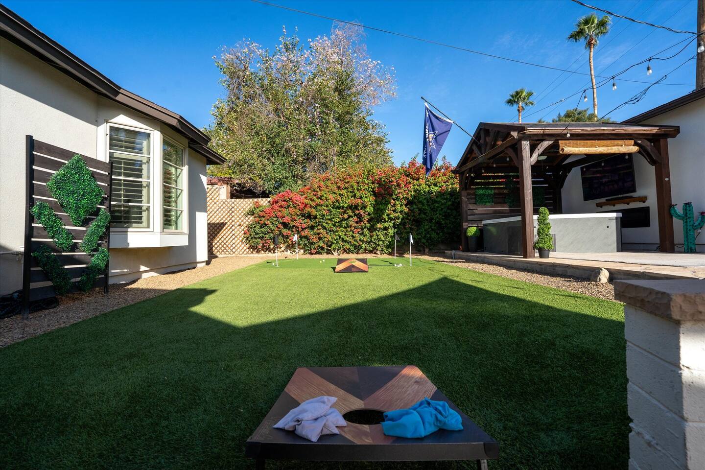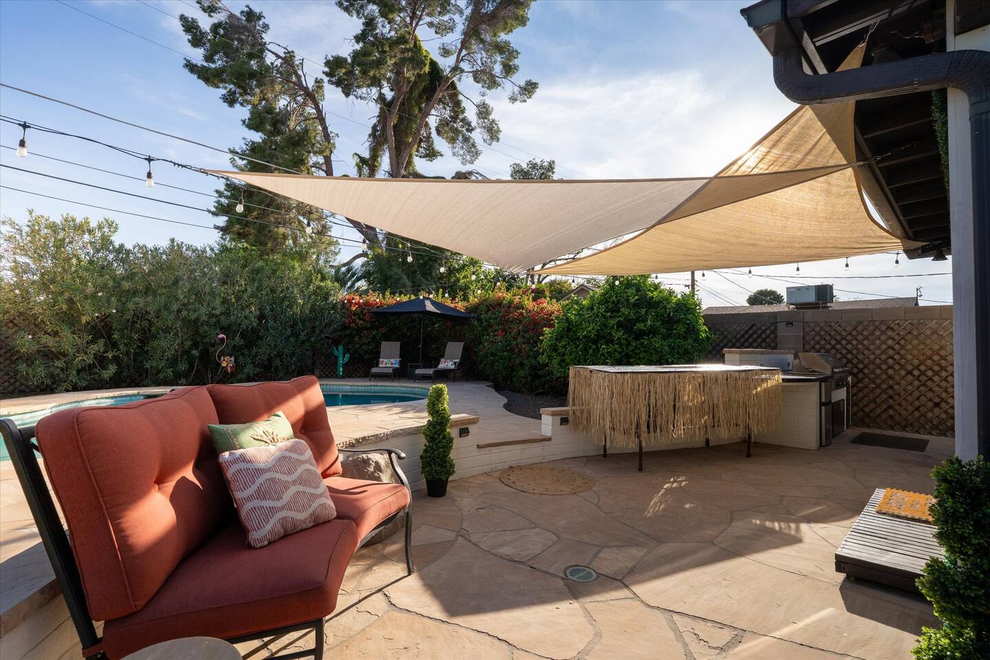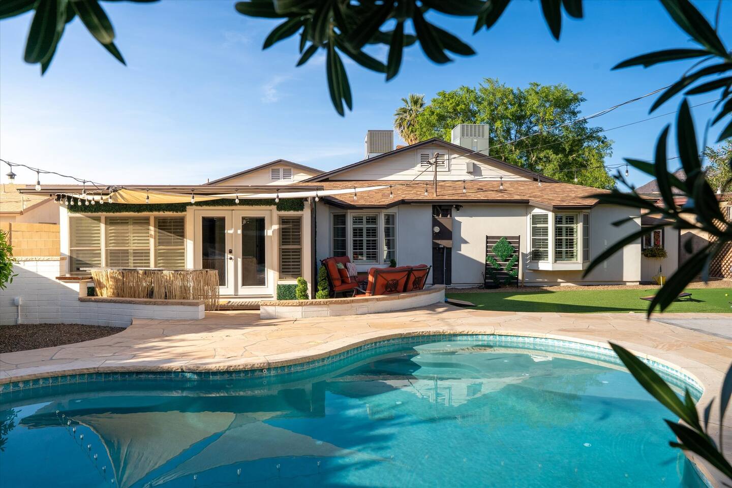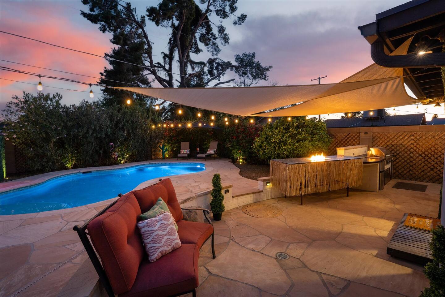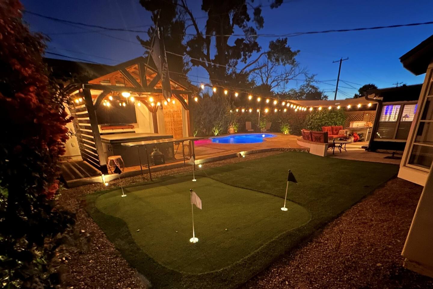 WHAT THIS PLACE OFFERS Bedrooms (4 - 2 King Beds & 2 Queen Beds) Bathrooms (3 Full) Bathtubs (2) Hair dryers & curling irons in each bathroom Cleaning products in each bathroom EcoWell H2O Therapy shampoo & body wash Hand soap in each bathroom & kitchen Navien NPE-240A on-demand hot water system Bath and pool towels Toilet paper, paper towels & Kleenex tissue Closet hangers Bed linens (2 sets per room) Room-darkening shutters and shades Ensuite walk-in closets, closets, nightstands, luggage stands and dressers Baby Pack ’n play/Travel crib Pool safety fence/gate system available HVAC - 2 air conditioning/central heating units Ceiling fans Christmas decorations LIVING ROOM & HOME THEATER Living room 85" Roku HDTV, Samsung Soundbar, designer couch/ottoman with 2 leather chairs 120" ONN Roku TV projector system, Sony surround sound speaker system and 2 leather reclining theater couches Nostalgia old-fashioned popcorn cart with candy dispenser Extra pillows and blankets Books, magazines and reading material Children’s books and toys Board games, trivia games, playing cards and puzzles HOME OFFICE & SUN/WELLNESS ROOM T--Mobile WIFI tower & service Dedicated adjustable height desk workspace with ViewSonic monitor and Logitech keyboard & mouse Private Sunlighten Amplify II 2-person full spectrum infrared sauna with chromotherapy & 2-speaker Bluetooth audio system ONN 44" Roku HDTV Gym Weights (5-20 lbs), Yoga Mats (2) & Resistance Bands Twin sofa sleeper bed for 2 kids and/or 2 extra guests KITCHEN, DRINK BAR & DINING Thermador & Whirlpool kitchen appliances Space where guests can cook their own meals Whirlpool refrigerator/freezer Whirlpool microwave/oven combo Frigidaire beverage refrigerator & Kismile icemaker Thermador natural gas cooktop/oven Thermador dishwasher Garbage disposal Dining table (6-person) Bar stool dining (2-person) COOKING BASICS Pots and pans Dishes, silverware and glassware (plastic sets for pool area) Bowls, chopsticks, plates, cups, etc. Keurig 2.0 coffee machine Haden hot water kettle Chefman coffee maker Wine and drink glassware (plastic sets for pool area) Toaster Baking sheet, tin, glassware and cooling racks Pizza sheet Breville blender BACKYARD OASIS Private outdoor lighted saltwater pool (not heated) - available all year, open specific hours, pool toys, child safe fencing system available to put in by guests, as needed, open from 7:00 AM to 9:00 PM Private Aquavoss hot/cold tub - available all year, open specific hours with outdoor entertainment systems (TV + soundbar) and Fosi Audio BT20A Bluetooth sound system, open from 7:00 AM to 9:00 PM Outdoor furniture Sun loungers (2) with umbrella Mini golf 4-hole putting green and turf outdoor games recreation area Outdoor dining areas (1 backyard high table with 4 chairs and built-in flame adjustable propane fire pit, 1 backyard low table with 2 couches for seating 5 and 1 front patio table with 4 chairs and umbrella) Private outdoor kitchen with BBQ grill (natural gas) BBQ tools, silpat cooking mat and cleaning products LAUNDRY ROOM Whirlpool Duet washer & dryer Utility sink Laundry essentials Laundry basket Drying rack with hangers for clothing Shark Rocket Deluxe Pro vacuum cleaner Libman floor sweeper Cosco stepstool Broom & dustpan HOME SECURITY SYSTEMS 4 monitored Ring exterior security cameras (carport, inside garage, the front door bell, and the backyard) All windows are monitored Front door Yale monitored keyless entry lock along with the 2 Nest thermostats Rear door Defiant monitored keyless entry lock Smoke alarms Carbon monoxide alarm (back bedroom for Navien NPE-240A on-demand hot water system) Fire extinguisher (laundry room) First aid kit (laundry room) Outlet covers (laundry room) PARKING Free carport on premises – 2 spaces