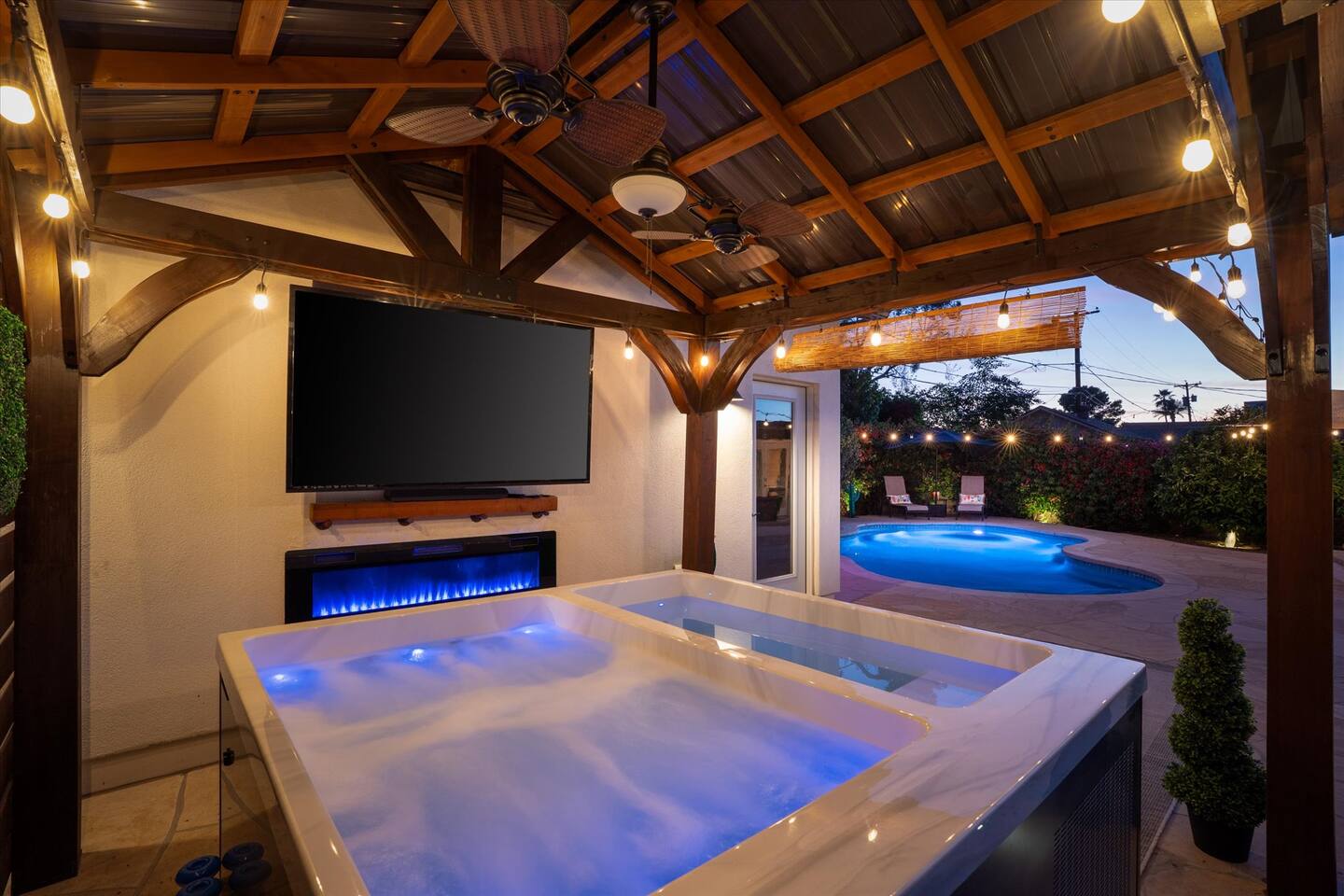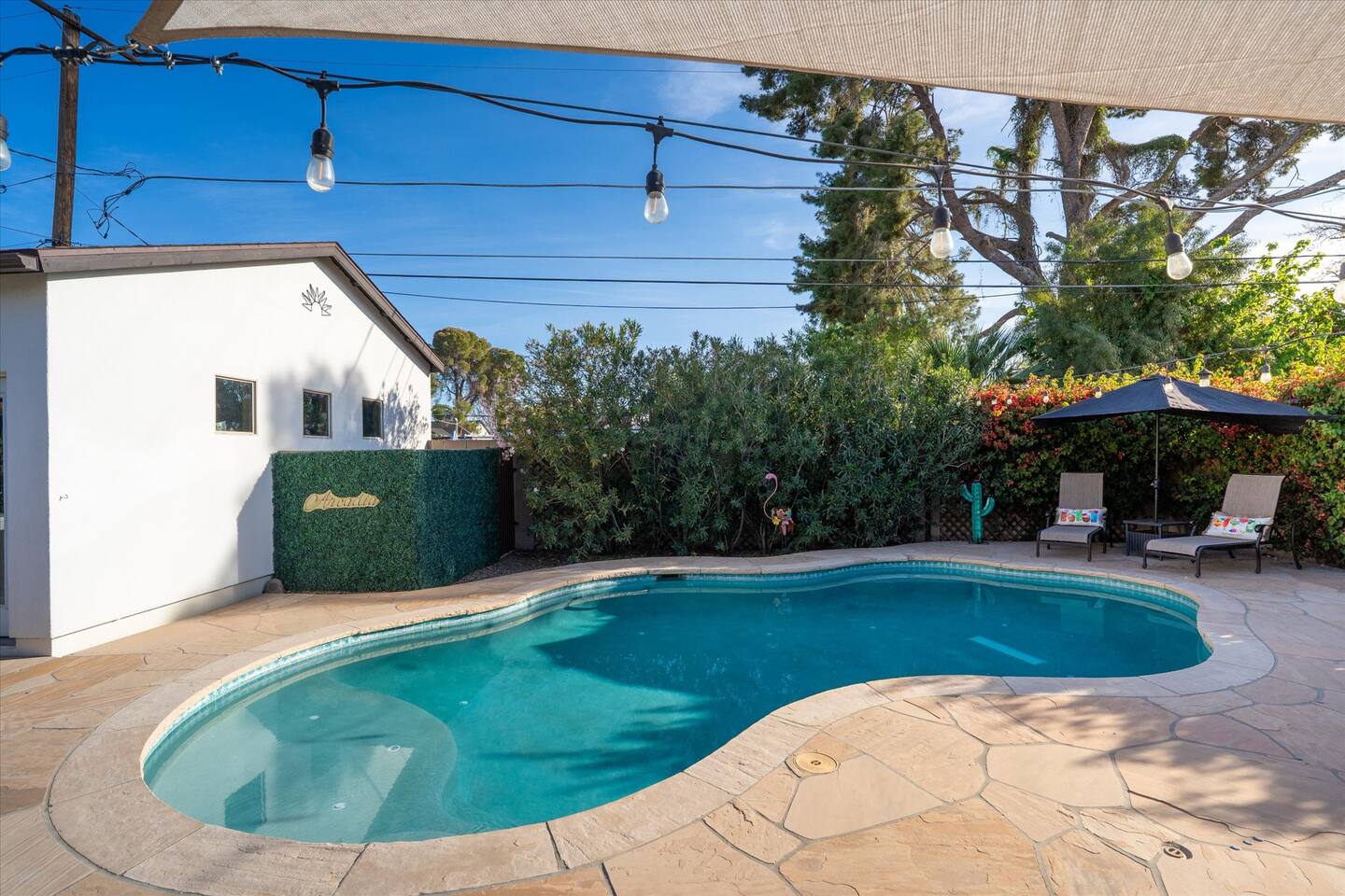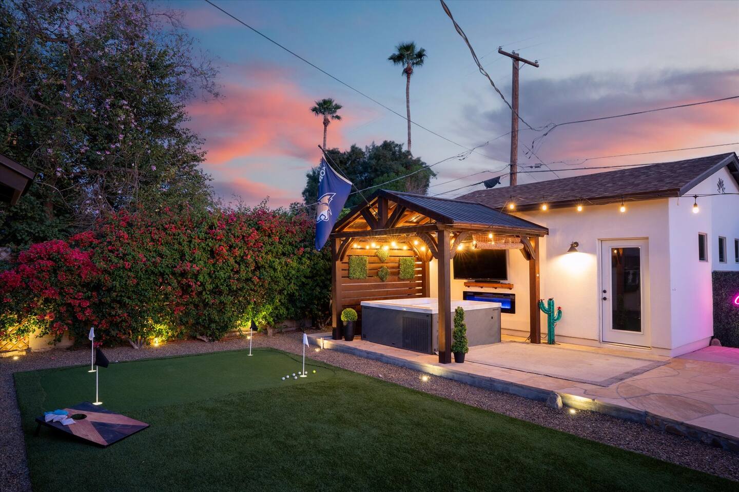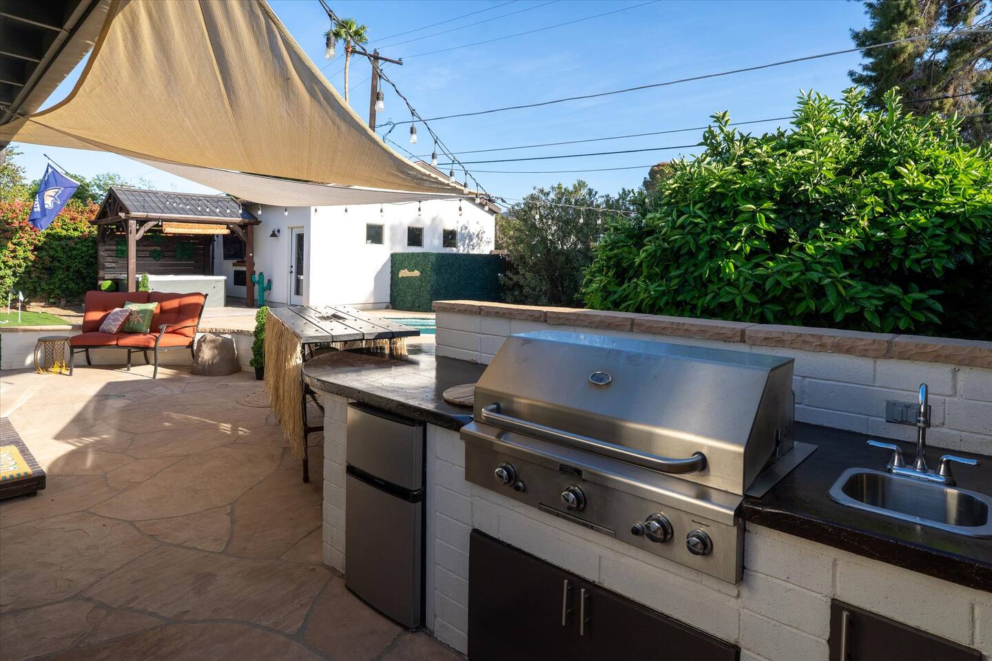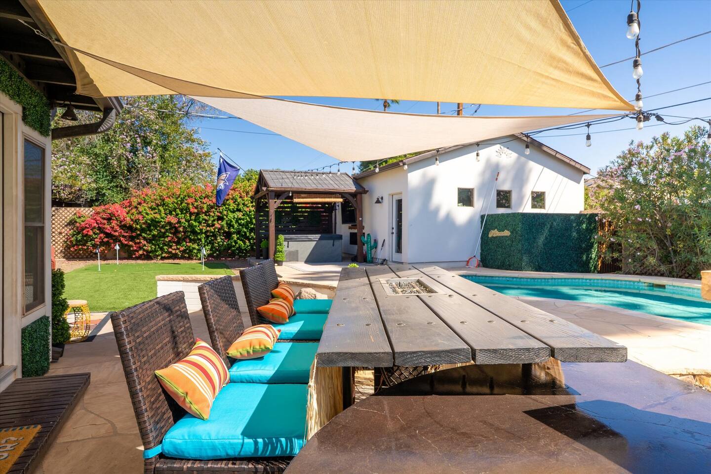 WHAT THIS PLACE OFFERS Bedrooms (4 - 2 King Beds & 2 Queen Beds) Bathrooms (3 Full) Bathtubs (2) Hair dryers & curling irons in each bathroom Cleaning products in each bathroom EcoWell H2O Therapy shampoo & body wash Hand soap in each bathroom & kitchen Navien NPE-240A on-demand hot water system Bath and pool towels Toilet paper, paper towels & Kleenex tissue Closet hangers Bed linens (2 sets per room) Room-darkening shutters and shades Ensuite walk-in closets, closets, nightstands, luggage stands and dressers Baby Pack ’n play/Travel crib Pool safety fence/gate system available HVAC - 2 air conditioning/central heating units Ceiling fans Christmas decorations LIVING ROOM & HOME THEATER Living room 85" Roku HDTV, Samsung Soundbar, designer couch/ottoman with 2 leather chairs 120" ONN Roku TV projector system, Sony surround sound speaker system and 2 leather reclining theater couches Nostalgia old-fashioned popcorn cart with candy dispenser Extra pillows and blankets Books, magazines and reading material Children’s books and toys Board games, trivia games, playing cards and puzzles HOME OFFICE & SUN/WELLNESS ROOM T--Mobile WIFI tower & service Dedicated adjustable height desk workspace with ViewSonic monitor and Logitech keyboard & mouse Private Sunlighten Amplify II 2-person full spectrum infrared sauna with chromotherapy & 2-speaker Bluetooth audio system ONN 44" Roku HDTV Gym Weights (5-20 lbs), Yoga Mats (2) & Resistance Bands Twin sofa sleeper bed for 2 kids and/or 2 extra guests KITCHEN, DRINK BAR & DINING Thermador & Whirlpool kitchen appliances Space where guests can cook their own meals Whirlpool refrigerator/freezer Whirlpool microwave/oven combo Frigidaire beverage refrigerator & Kismile icemaker Thermador natural gas cooktop/oven Thermador dishwasher Garbage disposal Dining table (6-person) Bar stool dining (2-person) COOKING BASICS Pots and pans Dishes, silverware and glassware (plastic sets for pool area) Bowls, chopsticks, plates, cups, etc. Keurig 2.0 coffee machine Haden hot water kettle Chefman coffee maker Wine and drink glassware (plastic sets for pool area) Toaster Baking sheet, tin, glassware and cooling racks Pizza sheet Breville blender BACKYARD OASIS Private outdoor lighted saltwater pool (not heated) - available all year, open specific hours, pool toys, child safe fencing system available to put in by guests, as needed, open from 7:00 AM to 9:00 PM Private Aquavoss hot/cold tub - available all year, open specific hours with outdoor entertainment systems (TV + soundbar) and Fosi Audio BT20A Bluetooth sound system, open from 7:00 AM to 9:00 PM Outdoor furniture Sun loungers (2) with umbrella Mini golf 4-hole putting green and turf outdoor games recreation area Outdoor dining areas (1 backyard high table with 4 chairs and built-in flame adjustable propane fire pit, 1 backyard low table with 2 couches for seating 5 and 1 front patio table with 4 chairs and umbrella) Private outdoor kitchen with BBQ grill (natural gas) BBQ tools, silpat cooking mat and cleaning products LAUNDRY ROOM Whirlpool Duet washer & dryer Utility sink Laundry essentials Laundry basket Drying rack with hangers for clothing Shark Rocket Deluxe Pro vacuum cleaner Libman floor sweeper Cosco stepstool Broom & dustpan HOME SECURITY SYSTEMS 4 monitored Ring exterior security cameras (carport, inside garage, the front door bell, and the backyard) All windows are monitored Front door Yale monitored keyless entry lock along with the 2 Nest thermostats Rear door Defiant monitored keyless entry lock Smoke alarms Carbon monoxide alarm (back bedroom for Navien NPE-240A on-demand hot water system) Fire extinguisher (laundry room) First aid kit (laundry room) Outlet covers (laundry room) PARKING Free carport on premises – 2 spaces