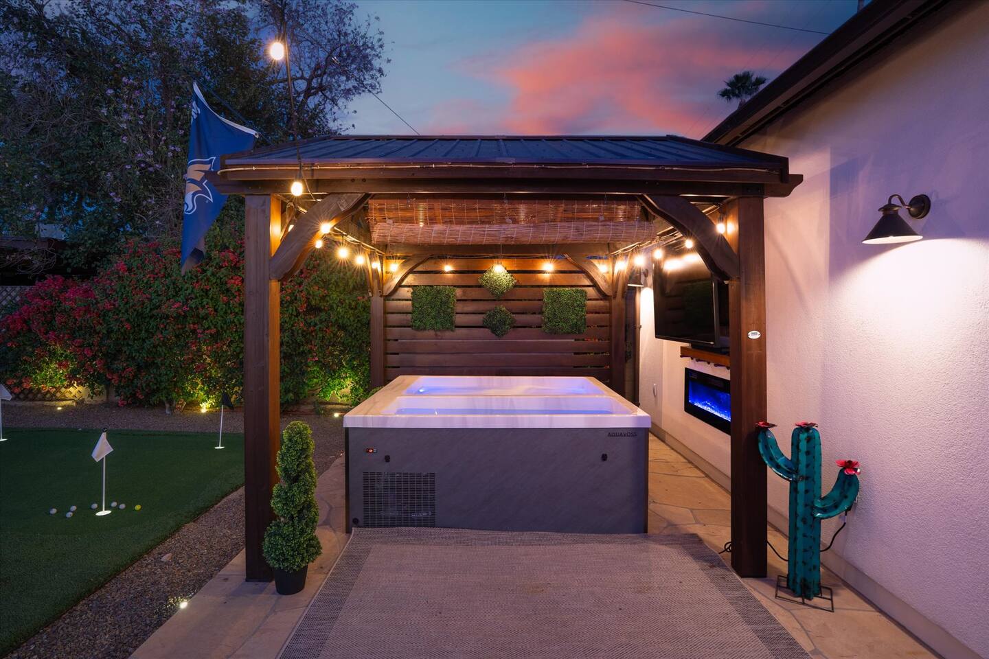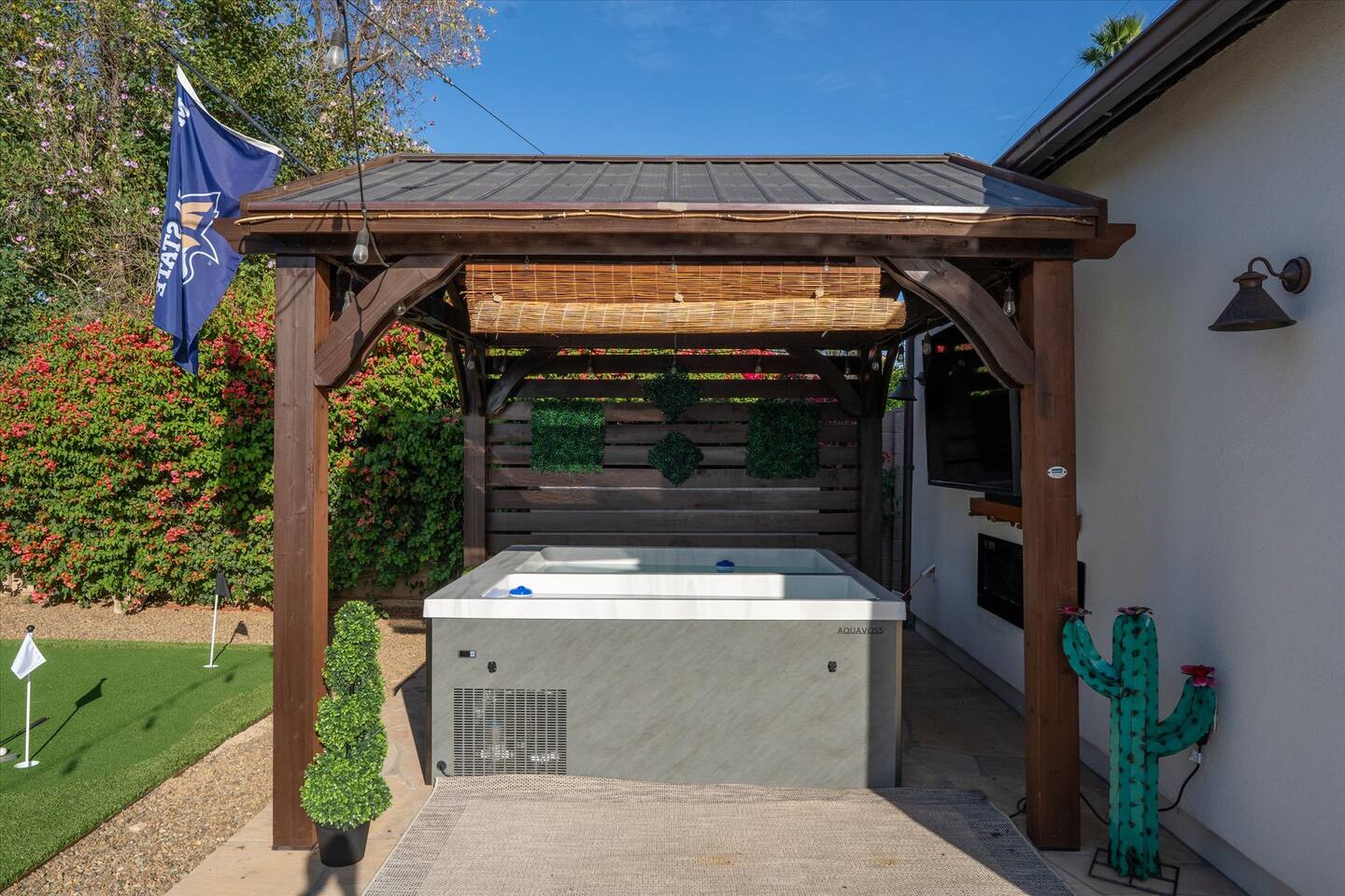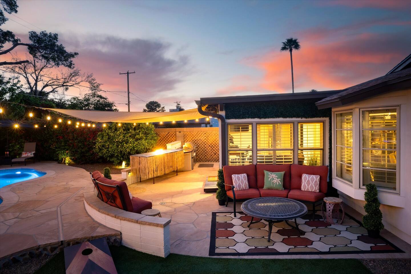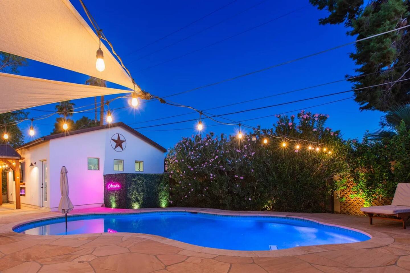 WHAT THIS PLACE OFFERS Bedrooms (4 - 2 King Beds & 2 Queen Beds) Bathrooms (3 Full) Bathtubs (2) Hair dryers & curling irons in each bathroom Cleaning products in each bathroom EcoWell H2O Therapy shampoo & body wash Hand soap in each bathroom & kitchen Navien NPE-240A on-demand hot water system Bath and pool towels Toilet paper, paper towels & Kleenex tissue Closet hangers Bed linens (2 sets per room) Room-darkening shutters and shades Ensuite walk-in closets, closets, nightstands, luggage stands and dressers Baby Pack ’n play/Travel crib Pool safety fence/gate system available HVAC - 2 air conditioning/central heating units Ceiling fans Christmas decorations LIVING ROOM & HOME THEATER Living room 85" Roku HDTV, Samsung Soundbar, designer couch/ottoman with 2 leather chairs 120" ONN Roku TV projector system, Sony surround sound speaker system and 2 leather reclining theater couches Nostalgia old-fashioned popcorn cart with candy dispenser Extra pillows and blankets Books, magazines and reading material Children’s books and toys Board games, trivia games, playing cards and puzzles HOME OFFICE & SUN/WELLNESS ROOM T--Mobile WIFI tower & service Dedicated adjustable height desk workspace with ViewSonic monitor and Logitech keyboard & mouse Private Sunlighten Amplify II 2-person full spectrum infrared sauna with chromotherapy & 2-speaker Bluetooth audio system ONN 44" Roku HDTV Gym Weights (5-20 lbs), Yoga Mats (2) & Resistance Bands Twin sofa sleeper bed for 2 kids and/or 2 extra guests KITCHEN, DRINK BAR & DINING Thermador & Whirlpool kitchen appliances Space where guests can cook their own meals Whirlpool refrigerator/freezer Whirlpool microwave/oven combo Frigidaire beverage refrigerator & Kismile icemaker Thermador natural gas cooktop/oven Thermador dishwasher Garbage disposal Dining table (6-person) Bar stool dining (2-person) COOKING BASICS Pots and pans Dishes, silverware and glassware (plastic sets for pool area) Bowls, chopsticks, plates, cups, etc. Keurig 2.0 coffee machine Haden hot water kettle Chefman coffee maker Wine and drink glassware (plastic sets for pool area) Toaster Baking sheet, tin, glassware and cooling racks Pizza sheet Breville blender BACKYARD OASIS Private outdoor lighted saltwater pool (not heated) - available all year, open specific hours, pool toys, child safe fencing system available to put in by guests, as needed, open from 7:00 AM to 9:00 PM Private Aquavoss hot/cold tub - available all year, open specific hours with outdoor entertainment systems (TV + soundbar) and Fosi Audio BT20A Bluetooth sound system, open from 7:00 AM to 9:00 PM Outdoor furniture Sun loungers (2) with umbrella Mini golf 4-hole putting green and turf outdoor games recreation area Outdoor dining areas (1 backyard high table with 4 chairs and built-in flame adjustable propane fire pit, 1 backyard low table with 2 couches for seating 5 and 1 front patio table with 4 chairs and umbrella) Private outdoor kitchen with BBQ grill (natural gas) BBQ tools, silpat cooking mat and cleaning products LAUNDRY ROOM Whirlpool Duet washer & dryer Utility sink Laundry essentials Laundry basket Drying rack with hangers for clothing Shark Rocket Deluxe Pro vacuum cleaner Libman floor sweeper Cosco stepstool Broom & dustpan HOME SECURITY SYSTEMS 4 monitored Ring exterior security cameras (carport, inside garage, the front door bell, and the backyard) All windows are monitored Front door Yale monitored keyless entry lock along with the 2 Nest thermostats Rear door Defiant monitored keyless entry lock Smoke alarms Carbon monoxide alarm (back bedroom for Navien NPE-240A on-demand hot water system) Fire extinguisher (laundry room) First aid kit (laundry room) Outlet covers (laundry room) PARKING Free carport on premises – 2 spaces