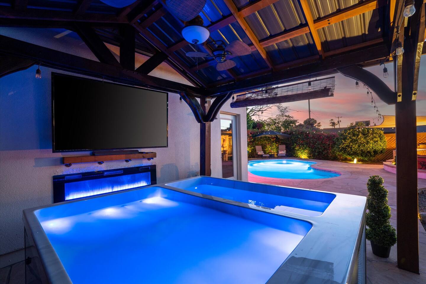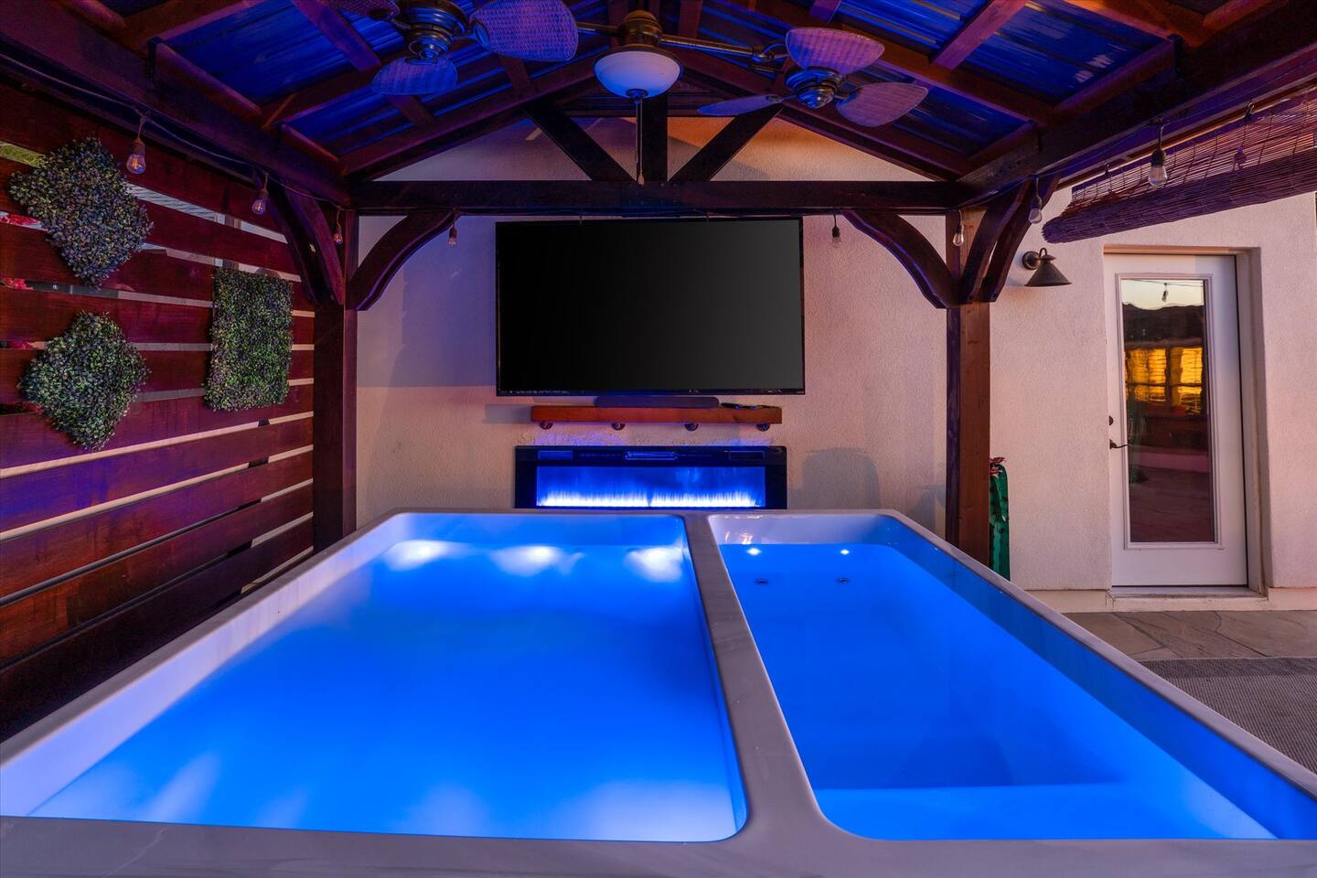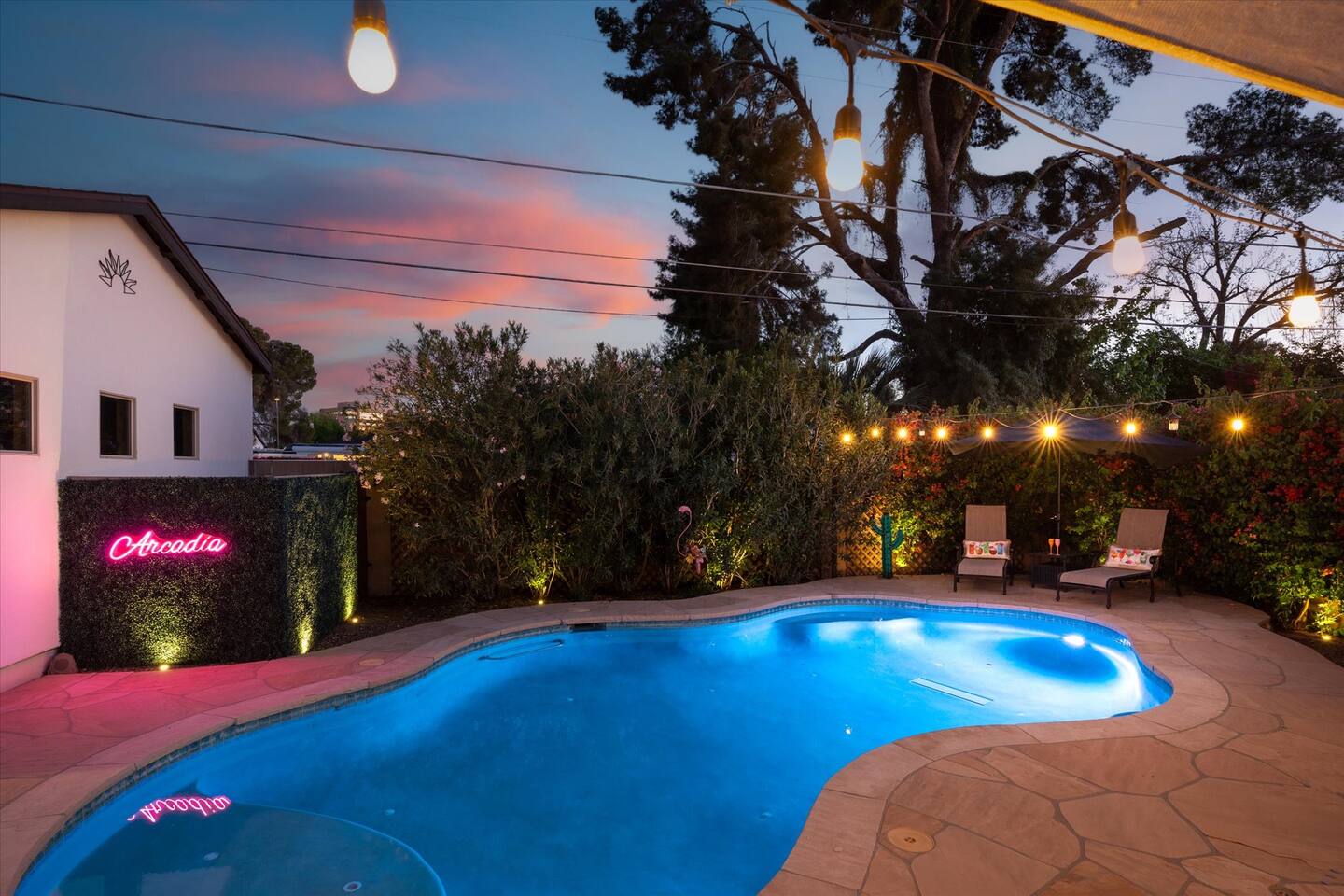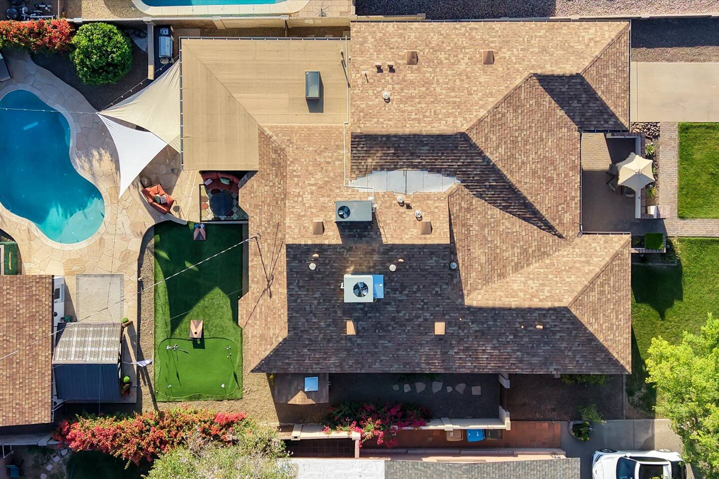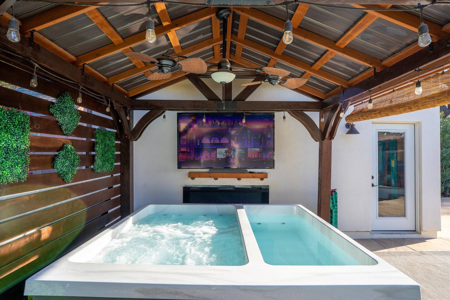 WHAT THIS PLACE OFFERS Bedrooms (4 - 2 King Beds & 2 Queen Beds) Bathrooms (3 Full) Bathtubs (2) Hair dryers & curling irons in each bathroom Cleaning products in each bathroom EcoWell H2O Therapy shampoo & body wash Hand soap in each bathroom & kitchen Navien NPE-240A on-demand hot water system Bath and pool towels Toilet paper, paper towels & Kleenex tissue Closet hangers Bed linens (2 sets per room) Room-darkening shutters and shades Ensuite walk-in closets, closets, nightstands, luggage stands and dressers Baby Pack ’n play/Travel crib Pool safety fence/gate system available HVAC - 2 air conditioning/central heating units Ceiling fans Christmas decorations LIVING ROOM & HOME THEATER Living room 85" Roku HDTV, Samsung Soundbar, designer couch/ottoman with 2 leather chairs 120" ONN Roku TV projector system, Sony surround sound speaker system and 2 leather reclining theater couches Nostalgia old-fashioned popcorn cart with candy dispenser Extra pillows and blankets Books, magazines and reading material Children’s books and toys Board games, trivia games, playing cards and puzzles HOME OFFICE & SUN/WELLNESS ROOM T--Mobile WIFI tower & service Dedicated adjustable height desk workspace with ViewSonic monitor and Logitech keyboard & mouse Private Sunlighten Amplify II 2-person full spectrum infrared sauna with chromotherapy & 2-speaker Bluetooth audio system ONN 44" Roku HDTV Gym Weights (5-20 lbs), Yoga Mats (2) & Resistance Bands Twin sofa sleeper bed for 2 kids and/or 2 extra guests KITCHEN, DRINK BAR & DINING Thermador & Whirlpool kitchen appliances Space where guests can cook their own meals Whirlpool refrigerator/freezer Whirlpool microwave/oven combo Frigidaire beverage refrigerator & Kismile icemaker Thermador natural gas cooktop/oven Thermador dishwasher Garbage disposal Dining table (6-person) Bar stool dining (2-person) COOKING BASICS Pots and pans Dishes, silverware and glassware (plastic sets for pool area) Bowls, chopsticks, plates, cups, etc. Keurig 2.0 coffee machine Haden hot water kettle Chefman coffee maker Wine and drink glassware (plastic sets for pool area) Toaster Baking sheet, tin, glassware and cooling racks Pizza sheet Breville blender BACKYARD OASIS Private outdoor lighted saltwater pool (not heated) - available all year, open specific hours, pool toys, child safe fencing system available to put in by guests, as needed, open from 7:00 AM to 9:00 PM Private Aquavoss hot/cold tub - available all year, open specific hours with outdoor entertainment systems (TV + soundbar) and Fosi Audio BT20A Bluetooth sound system, open from 7:00 AM to 9:00 PM Outdoor furniture Sun loungers (2) with umbrella Mini golf 4-hole putting green and turf outdoor games recreation area Outdoor dining areas (1 backyard high table with 4 chairs and built-in flame adjustable propane fire pit, 1 backyard low table with 2 couches for seating 5 and 1 front patio table with 4 chairs and umbrella) Private outdoor kitchen with BBQ grill (natural gas) BBQ tools, silpat cooking mat and cleaning products LAUNDRY ROOM Whirlpool Duet washer & dryer Utility sink Laundry essentials Laundry basket Drying rack with hangers for clothing Shark Rocket Deluxe Pro vacuum cleaner Libman floor sweeper Cosco stepstool Broom & dustpan HOME SECURITY SYSTEMS 4 monitored Ring exterior security cameras (carport, inside garage, the front door bell, and the backyard) All windows are monitored Front door Yale monitored keyless entry lock along with the 2 Nest thermostats Rear door Defiant monitored keyless entry lock Smoke alarms Carbon monoxide alarm (back bedroom for Navien NPE-240A on-demand hot water system) Fire extinguisher (laundry room) First aid kit (laundry room) Outlet covers (laundry room) PARKING Free carport on premises – 2 spaces