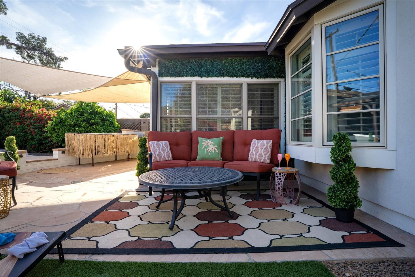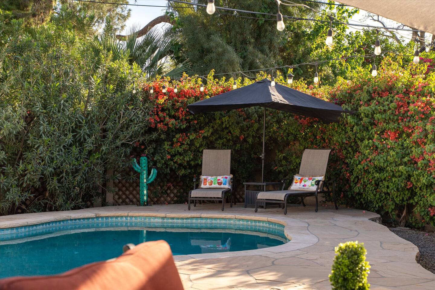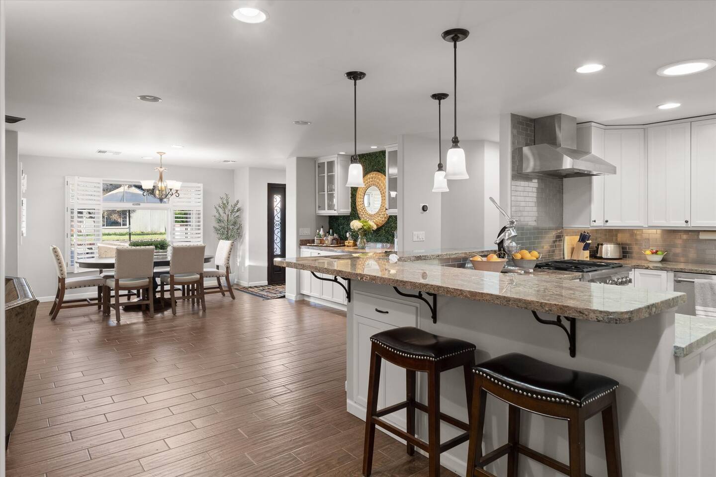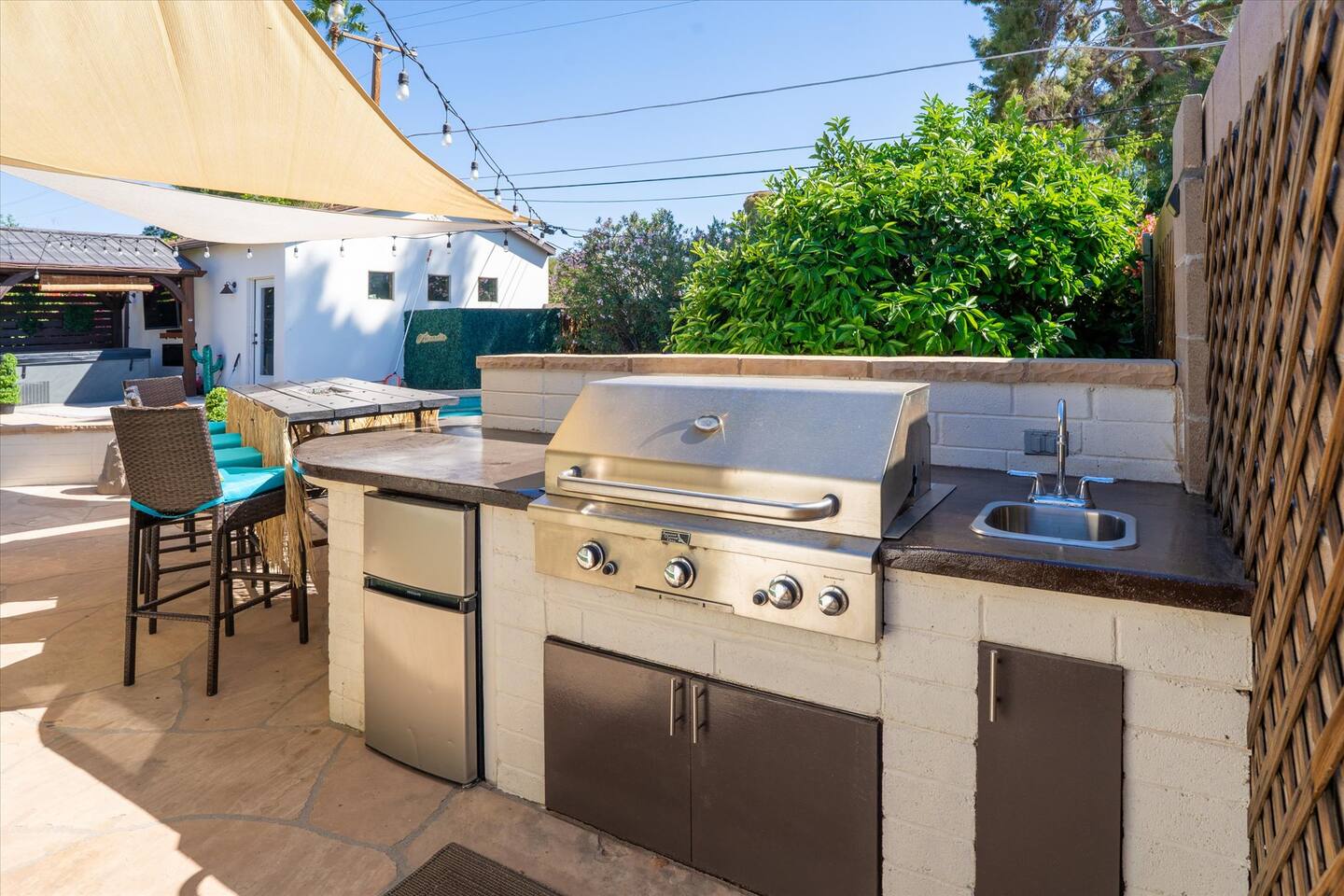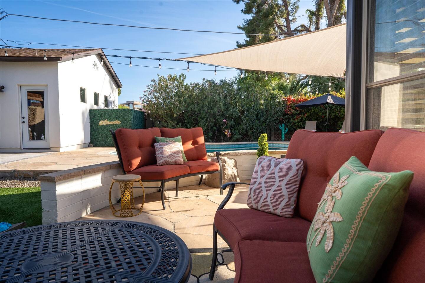 WHAT THIS PLACE OFFERS Bedrooms (4 - 2 King Beds & 2 Queen Beds) Bathrooms (3 Full) Bathtubs (2) Hair dryers & curling irons in each bathroom Cleaning products in each bathroom EcoWell H2O Therapy shampoo & body wash Hand soap in each bathroom & kitchen Navien NPE-240A on-demand hot water system Bath and pool towels Toilet paper, paper towels & Kleenex tissue Closet hangers Bed linens (2 sets per room) Room-darkening shutters and shades Ensuite walk-in closets, closets, nightstands, luggage stands and dressers Baby Pack ’n play/Travel crib Pool safety fence/gate system available HVAC - 2 air conditioning/central heating units Ceiling fans Christmas decorations LIVING ROOM & HOME THEATER Living room 85" Roku HDTV, Samsung Soundbar, designer couch/ottoman with 2 leather chairs 120" ONN Roku TV projector system, Sony surround sound speaker system and 2 leather reclining theater couches Nostalgia old-fashioned popcorn cart with candy dispenser Extra pillows and blankets Books, magazines and reading material Children’s books and toys Board games, trivia games, playing cards and puzzles HOME OFFICE & SUN/WELLNESS ROOM T--Mobile WIFI tower & service Dedicated adjustable height desk workspace with ViewSonic monitor and Logitech keyboard & mouse Private Sunlighten Amplify II 2-person full spectrum infrared sauna with chromotherapy & 2-speaker Bluetooth audio system ONN 44" Roku HDTV Gym Weights (5-20 lbs), Yoga Mats (2) & Resistance Bands Twin sofa sleeper bed for 2 kids and/or 2 extra guests KITCHEN, DRINK BAR & DINING Thermador & Whirlpool kitchen appliances Space where guests can cook their own meals Whirlpool refrigerator/freezer Whirlpool microwave/oven combo Frigidaire beverage refrigerator & Kismile icemaker Thermador natural gas cooktop/oven Thermador dishwasher Garbage disposal Dining table (6-person) Bar stool dining (2-person) COOKING BASICS Pots and pans Dishes, silverware and glassware (plastic sets for pool area) Bowls, chopsticks, plates, cups, etc. Keurig 2.0 coffee machine Haden hot water kettle Chefman coffee maker Wine and drink glassware (plastic sets for pool area) Toaster Baking sheet, tin, glassware and cooling racks Pizza sheet Breville blender BACKYARD OASIS Private outdoor lighted saltwater pool (not heated) - available all year, open specific hours, pool toys, child safe fencing system available to put in by guests, as needed, open from 7:00 AM to 9:00 PM Private Aquavoss hot/cold tub - available all year, open specific hours with outdoor entertainment systems (TV + soundbar) and Fosi Audio BT20A Bluetooth sound system, open from 7:00 AM to 9:00 PM Outdoor furniture Sun loungers (2) with umbrella Mini golf 4-hole putting green and turf outdoor games recreation area Outdoor dining areas (1 backyard high table with 4 chairs and built-in flame adjustable propane fire pit, 1 backyard low table with 2 couches for seating 5 and 1 front patio table with 4 chairs and umbrella) Private outdoor kitchen with BBQ grill (natural gas) BBQ tools, silpat cooking mat and cleaning products LAUNDRY ROOM Whirlpool Duet washer & dryer Utility sink Laundry essentials Laundry basket Drying rack with hangers for clothing Shark Rocket Deluxe Pro vacuum cleaner Libman floor sweeper Cosco stepstool Broom & dustpan HOME SECURITY SYSTEMS 4 monitored Ring exterior security cameras (carport, inside garage, the front door bell, and the backyard) All windows are monitored Front door Yale monitored keyless entry lock along with the 2 Nest thermostats Rear door Defiant monitored keyless entry lock Smoke alarms Carbon monoxide alarm (back bedroom for Navien NPE-240A on-demand hot water system) Fire extinguisher (laundry room) First aid kit (laundry room) Outlet covers (laundry room) PARKING Free carport on premises – 2 spaces