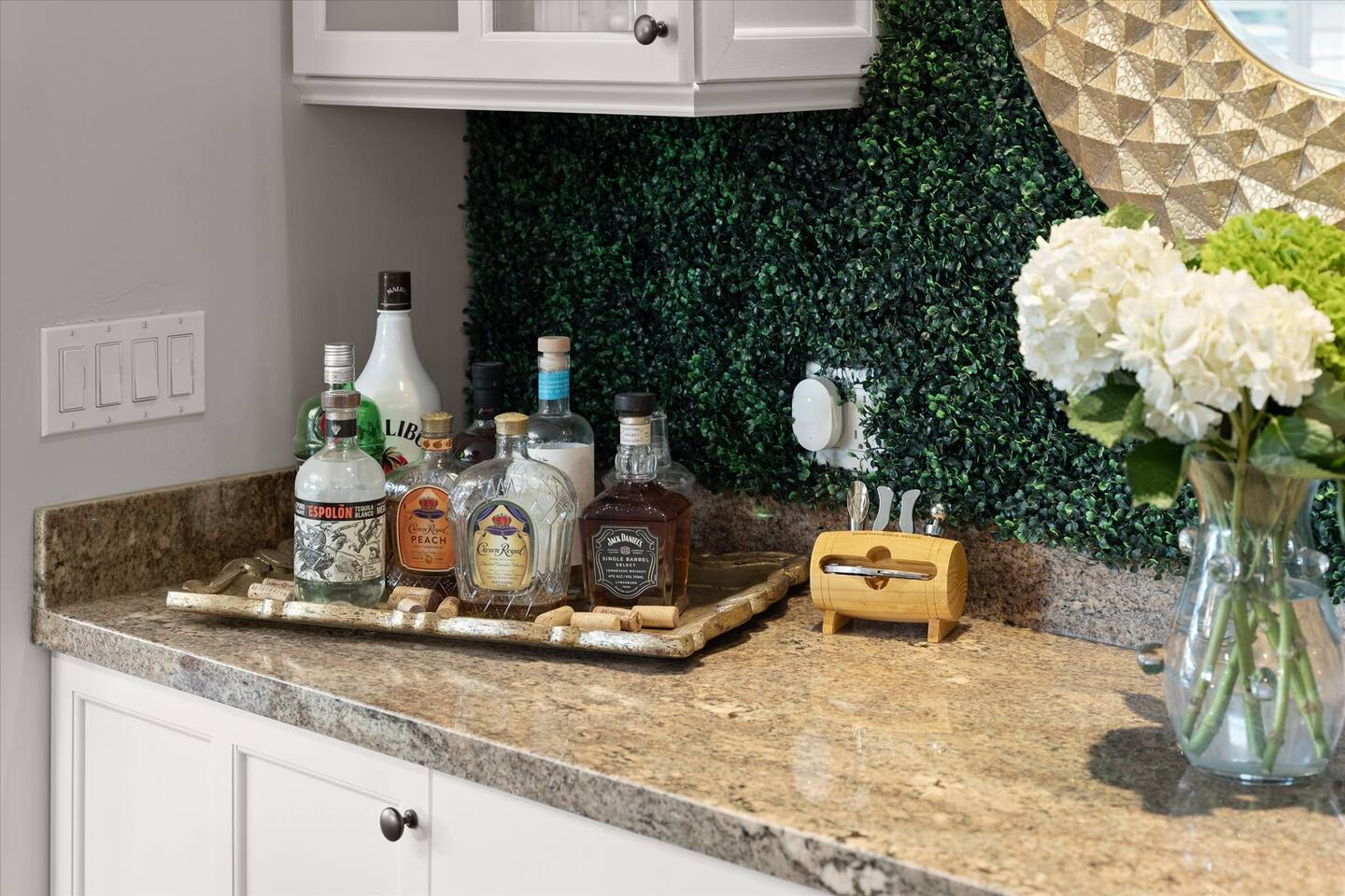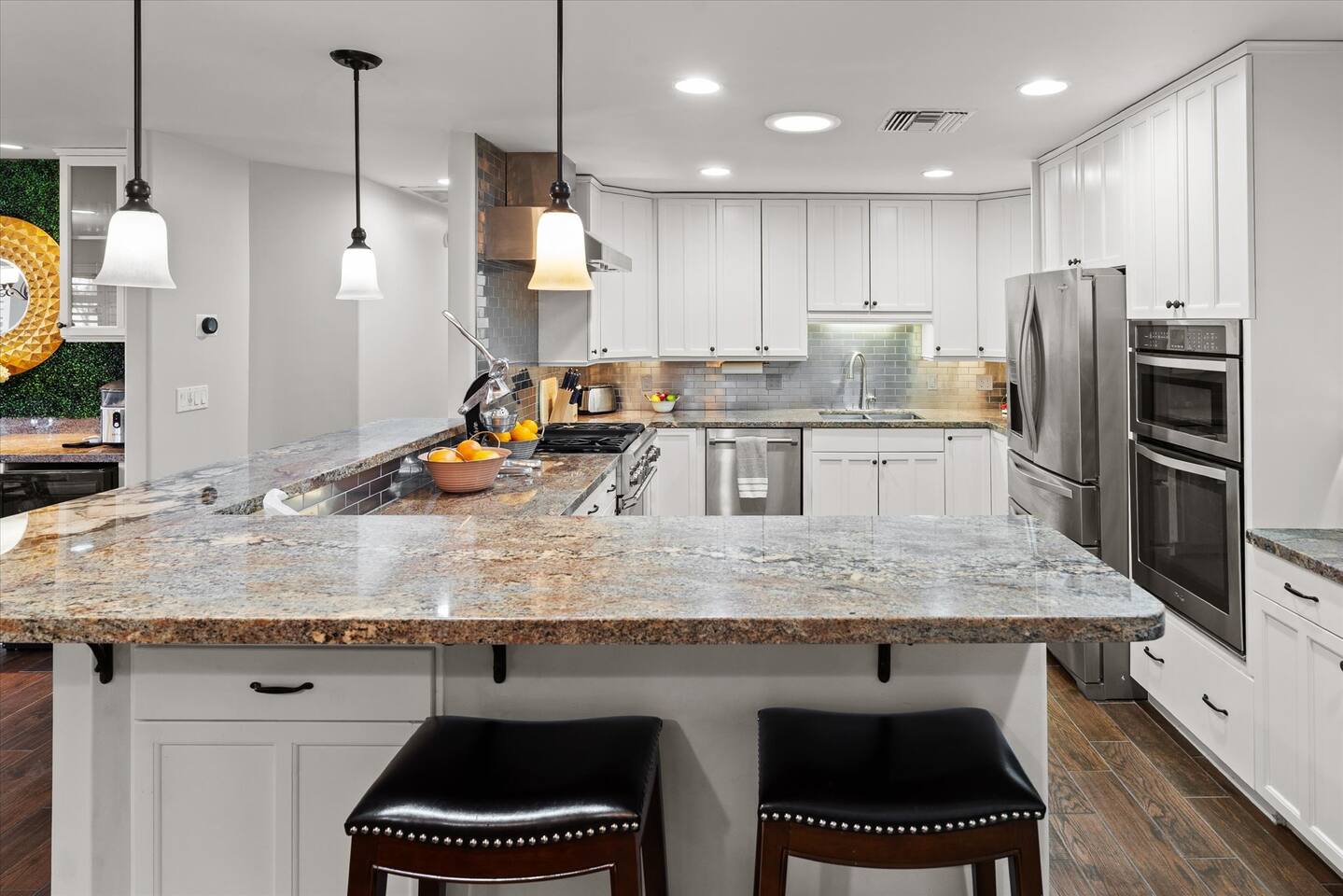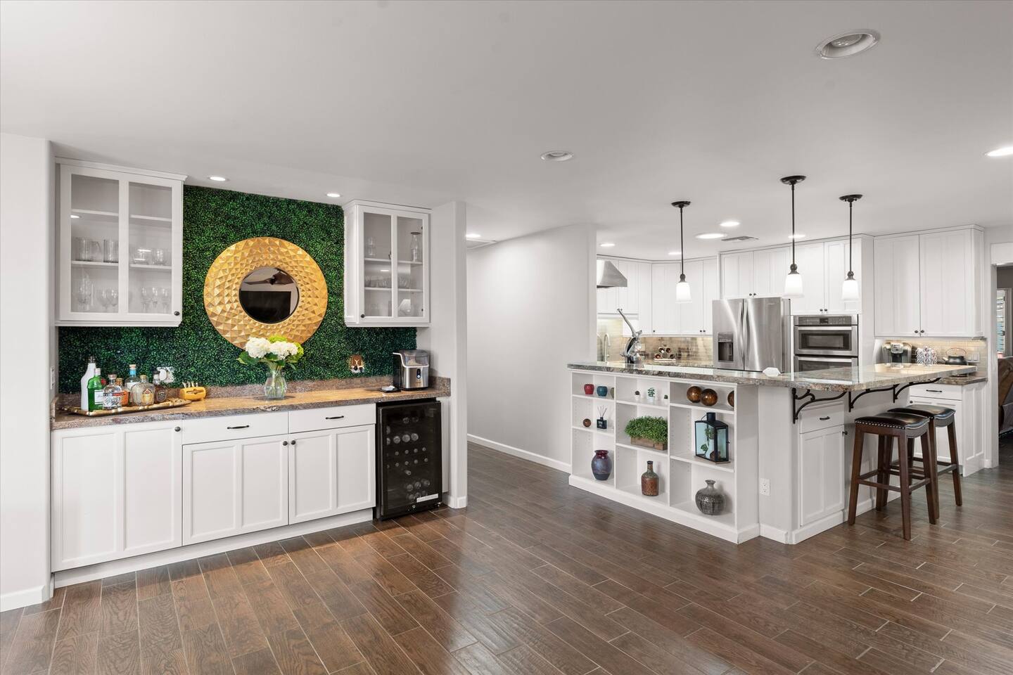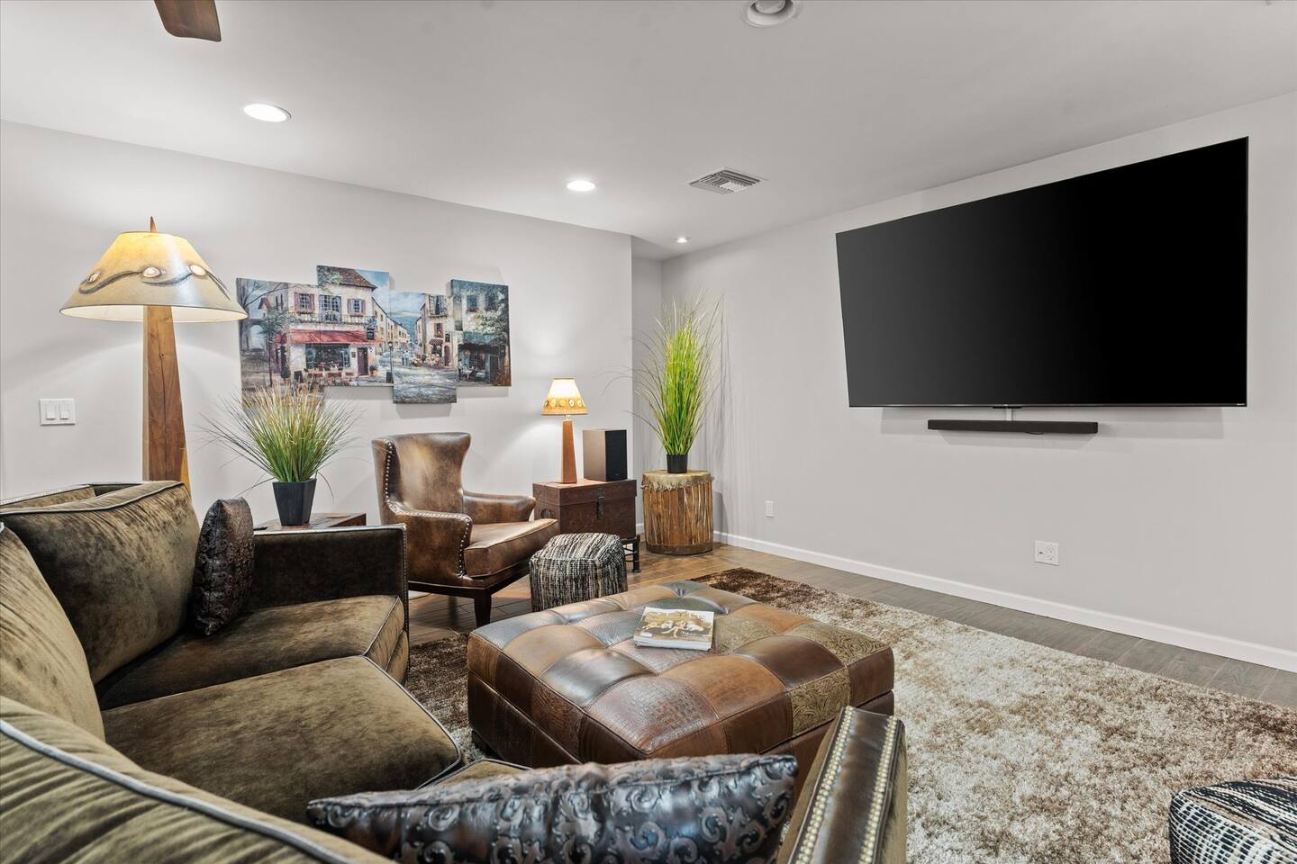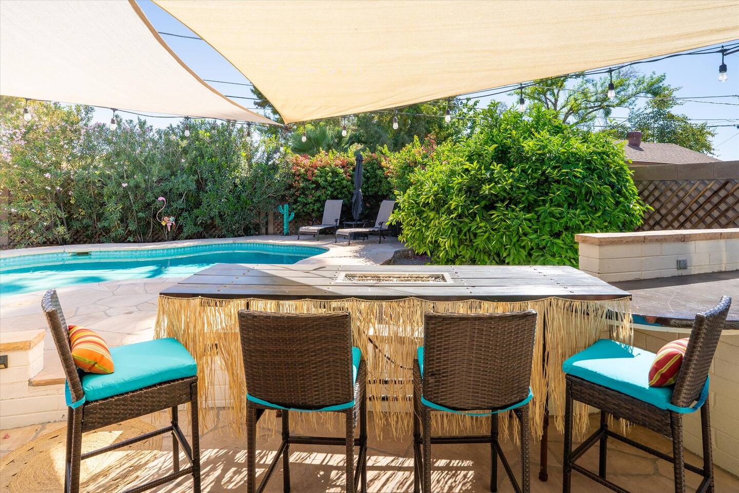 WHAT THIS PLACE OFFERS Bedrooms (4 - 2 King Beds & 2 Queen Beds) Bathrooms (3 Full) Bathtubs (2) Hair dryers & curling irons in each bathroom Cleaning products in each bathroom EcoWell H2O Therapy shampoo & body wash Hand soap in each bathroom & kitchen Navien NPE-240A on-demand hot water system Bath and pool towels Toilet paper, paper towels & Kleenex tissue Closet hangers Bed linens (2 sets per room) Room-darkening shutters and shades Ensuite walk-in closets, closets, nightstands, luggage stands and dressers Baby Pack ’n play/Travel crib Pool safety fence/gate system available HVAC - 2 air conditioning/central heating units Ceiling fans Christmas decorations LIVING ROOM & HOME THEATER Living room 85" Roku HDTV, Samsung Soundbar, designer couch/ottoman with 2 leather chairs 120" ONN Roku TV projector system, Sony surround sound speaker system and 2 leather reclining theater couches Nostalgia old-fashioned popcorn cart with candy dispenser Extra pillows and blankets Books, magazines and reading material Children’s books and toys Board games, trivia games, playing cards and puzzles HOME OFFICE & SUN/WELLNESS ROOM T--Mobile WIFI tower & service Dedicated adjustable height desk workspace with ViewSonic monitor and Logitech keyboard & mouse Private Sunlighten Amplify II 2-person full spectrum infrared sauna with chromotherapy & 2-speaker Bluetooth audio system ONN 44" Roku HDTV Gym Weights (5-20 lbs), Yoga Mats (2) & Resistance Bands Twin sofa sleeper bed for 2 kids and/or 2 extra guests KITCHEN, DRINK BAR & DINING Thermador & Whirlpool kitchen appliances Space where guests can cook their own meals Whirlpool refrigerator/freezer Whirlpool microwave/oven combo Frigidaire beverage refrigerator & Kismile icemaker Thermador natural gas cooktop/oven Thermador dishwasher Garbage disposal Dining table (6-person) Bar stool dining (2-person) COOKING BASICS Pots and pans Dishes, silverware and glassware (plastic sets for pool area) Bowls, chopsticks, plates, cups, etc. Keurig 2.0 coffee machine Haden hot water kettle Chefman coffee maker Wine and drink glassware (plastic sets for pool area) Toaster Baking sheet, tin, glassware and cooling racks Pizza sheet Breville blender BACKYARD OASIS Private outdoor lighted saltwater pool (not heated) - available all year, open specific hours, pool toys, child safe fencing system available to put in by guests, as needed, open from 7:00 AM to 9:00 PM Private Aquavoss hot/cold tub - available all year, open specific hours with outdoor entertainment systems (TV + soundbar) and Fosi Audio BT20A Bluetooth sound system, open from 7:00 AM to 9:00 PM Outdoor furniture Sun loungers (2) with umbrella Mini golf 4-hole putting green and turf outdoor games recreation area Outdoor dining areas (1 backyard high table with 4 chairs and built-in flame adjustable propane fire pit, 1 backyard low table with 2 couches for seating 5 and 1 front patio table with 4 chairs and umbrella) Private outdoor kitchen with BBQ grill (natural gas) BBQ tools, silpat cooking mat and cleaning products LAUNDRY ROOM Whirlpool Duet washer & dryer Utility sink Laundry essentials Laundry basket Drying rack with hangers for clothing Shark Rocket Deluxe Pro vacuum cleaner Libman floor sweeper Cosco stepstool Broom & dustpan HOME SECURITY SYSTEMS 4 monitored Ring exterior security cameras (carport, inside garage, the front door bell, and the backyard) All windows are monitored Front door Yale monitored keyless entry lock along with the 2 Nest thermostats Rear door Defiant monitored keyless entry lock Smoke alarms Carbon monoxide alarm (back bedroom for Navien NPE-240A on-demand hot water system) Fire extinguisher (laundry room) First aid kit (laundry room) Outlet covers (laundry room) PARKING Free carport on premises – 2 spaces